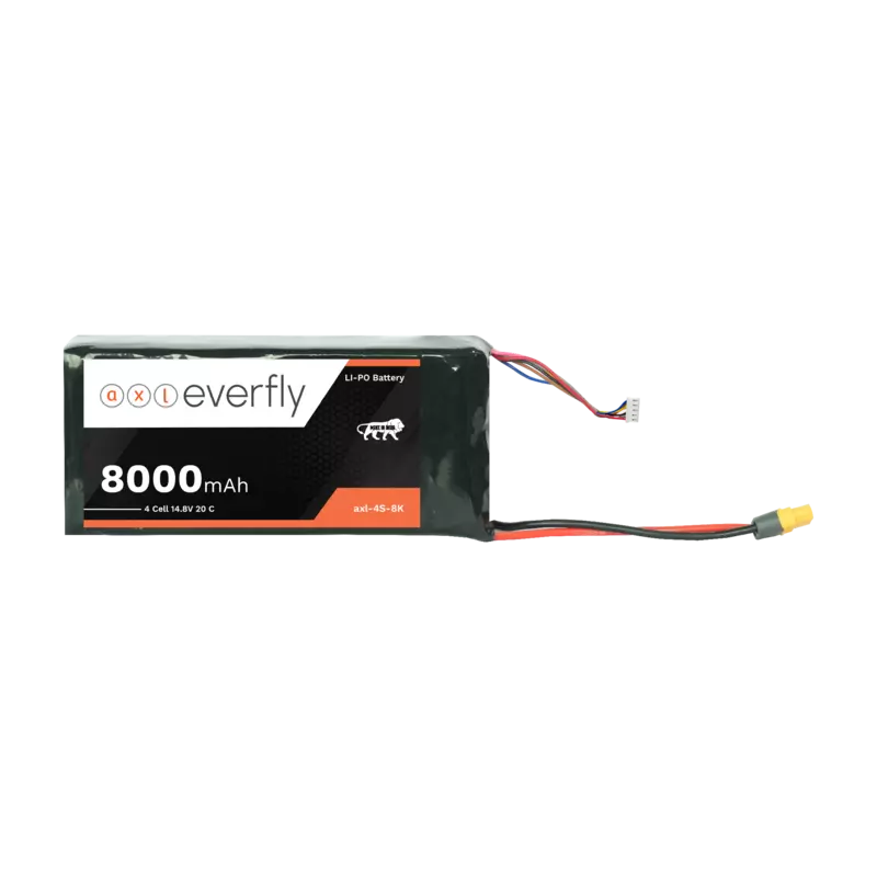 The axl everfly 8000mAh 4S (14.8V) LiPo battery is designed for reliable power delivery in compatible drones, RC vehicles, robotics platforms, and UAV systems that require a 4S input. With a 20C continuous discharge rate, it provides stable output for applications demanding steady current performance. The 8000mAh capacity supports extended operating time depending on system load and efficiency. Built with quality LiPo cells for consistent performance across charge cycles, it features XT60H and JST-XH connectors for secure, low-resistance power transfer.
