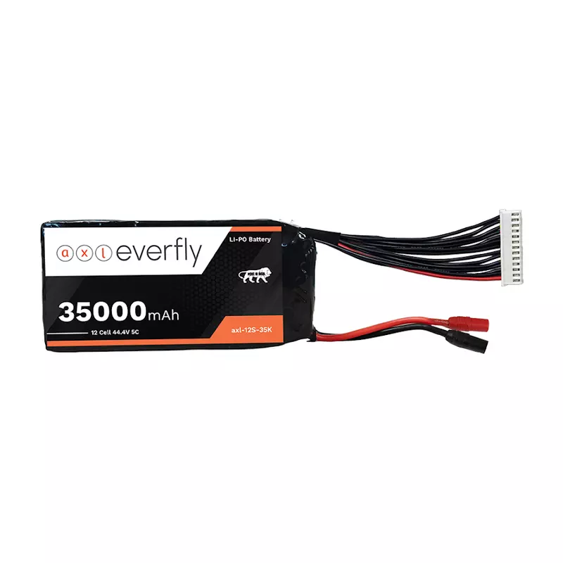 The axl everfly 35000mAh 12S (44.4V) LiPo battery is designed for high-voltage platforms requiring substantial energy capacity and consistent power delivery. With a 35,000mAh capacity and a 5C discharge rating, it is suited for systems operating under steady and controlled load conditions.