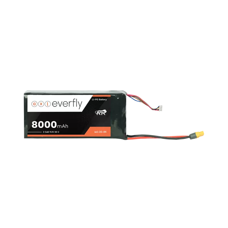 The axl everfly 8000mAh 3S (11.1V) LiPo battery is designed for reliable power delivery in compatible drones, RC vehicles, robotics platforms, and UAV systems. With a 20C discharge rate and high energy density, this lightweight 3S LiPo drone battery ensures stable output, good flight time, and consistent performance under load. Built with premium-grade cells for durability and long cycle life, it features secure XT60H and JST-XH connectors for safe, low-resistance power transfer.