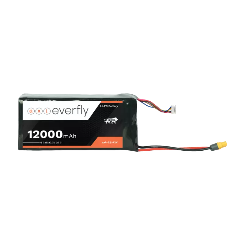The axl everfly 12000mAh 6S (22.2V) LiPo battery is designed for reliable power delivery in compatible high-voltage drone platforms, industrial UAV systems, robotics, and large RC vehicles applications requiring a 6S input. With a 20C continuous discharge rate, it provides stable current output for demanding 22.2V power systems.